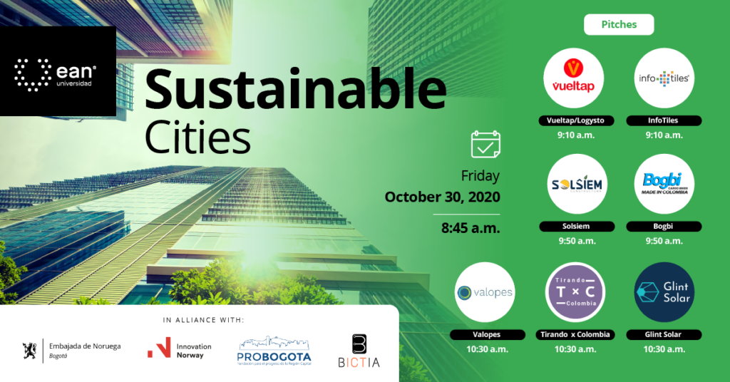 Continuing its commitment to sustainable entrepreneurship as a tool for socio-economic development, Ean University —in partnership with the Royal Norwegian Embassy in Colombia, Innovation Norway, Bictia, and ProBogotá — organized the event Sustainable Cities
