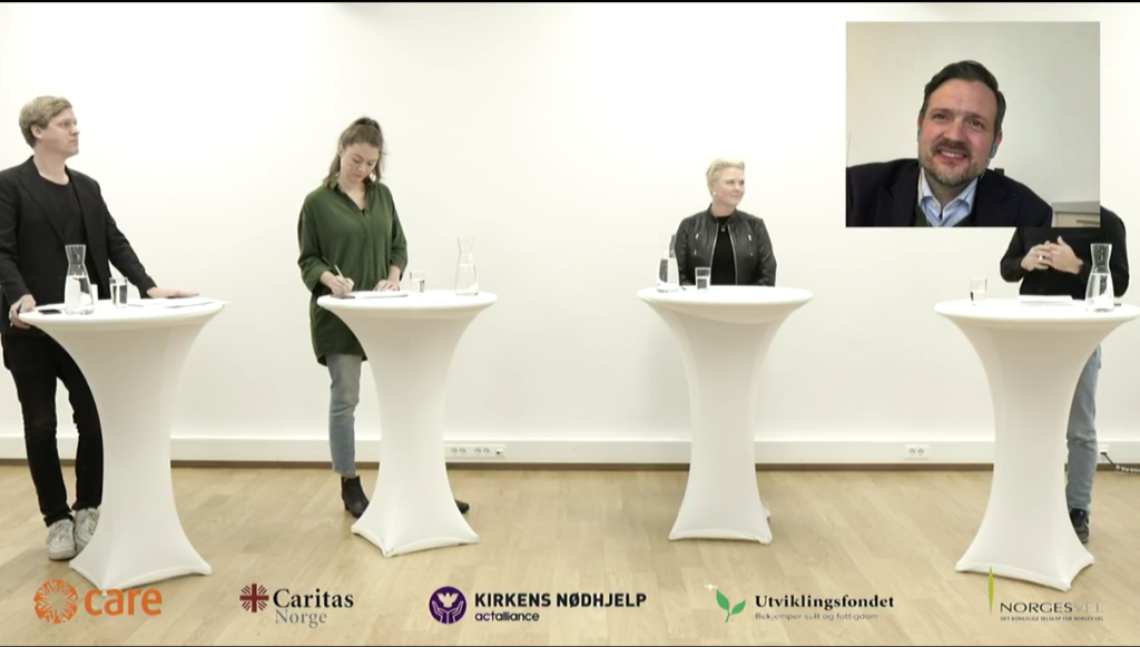 • Political panel on how Norway can take more action consisting of: Dag Inge Ulstein, minister of development (KrF), Åsmund Aukrust, member of parliament (AP), Anne Beate Tvinnereim (SP), Sigrid Heiberg (MDG). With comments from Ola Westengen associate professor at Norwegian University of Life Sciences (NMBU)